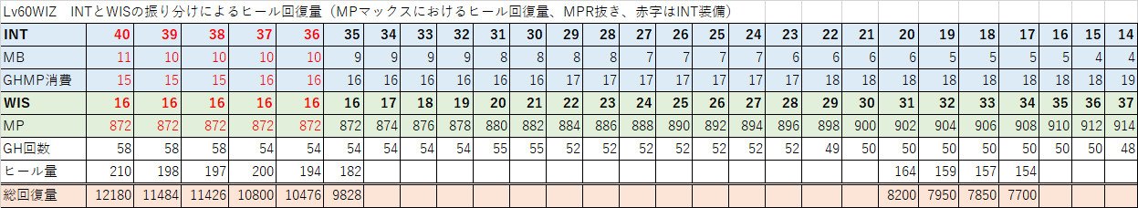 INTとWISの振り分けによる、総MP量に対する総ヒール量を試算してみました